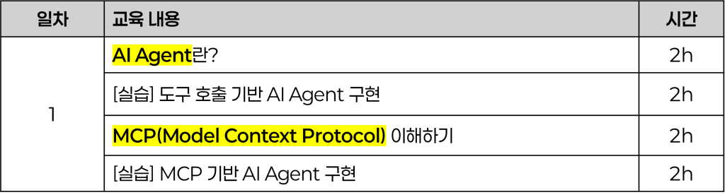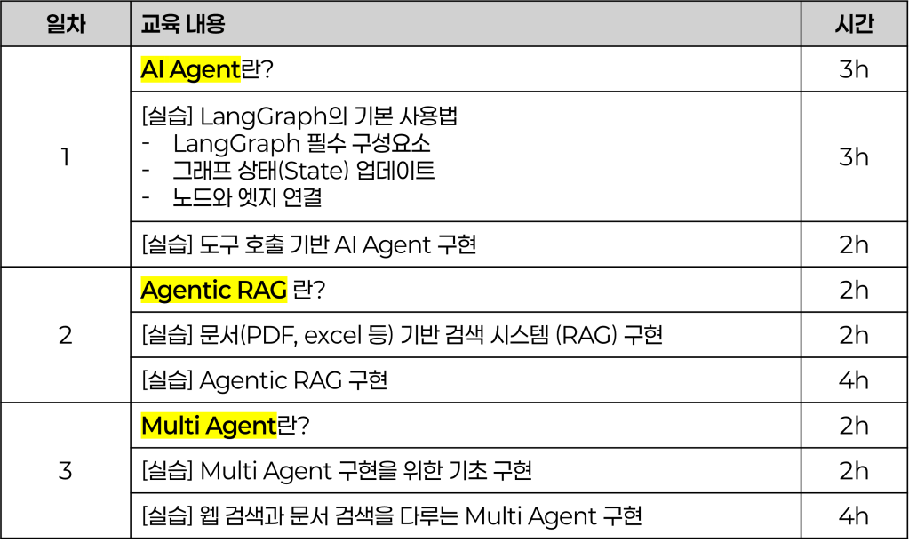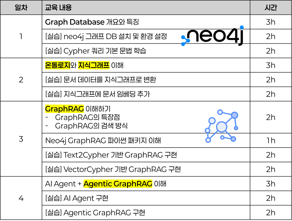 당일 과정으로 진행되는 단기 과정 예시입니다. 2시간 짜리 특강 및 세미나부터, 알차게 담은 8시간 강의까지 AI Agent, GraphRAG, LLM 등의 주제로 유연한 강의 설계가 가능하니 참고 부탁드립니다 🙂